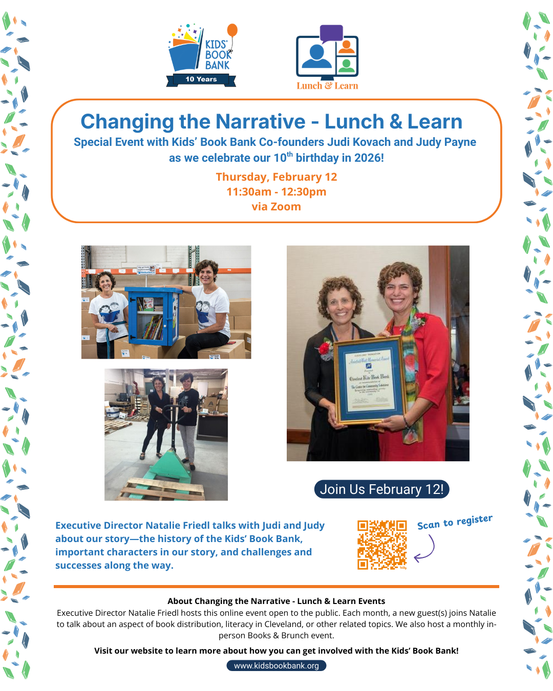 Throughout the year, Kids’ Book Bank staff will host events around the theme of Books Change the Narrative. These online and in-person events are open to anyone interested in learning about the Kids’ Book Bank, literacy in Cleveland, and how partners are working together to impact literacy in our area.
